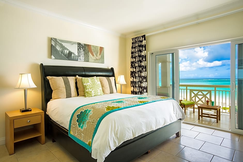 The Two Bedroom Ocean Front suite features balconies or terraces with direct ocean views facing Grace Bay. Master bedroom comes with a king bed, flat screen TV and a full private bathroom with a tub and shower. The second bedroom offers 2 twin beds that can be converted to a king bed, flat screen TV and a bathroom with a tub and shower. The living room features a queen sleeper sofa, ½ bathroom and a flat screen TV. All suites feature A/C, ceiling fans, US & international cable TV channels, laptop-size safe, washer/dryer, a full kitchen and iron and ironing board.